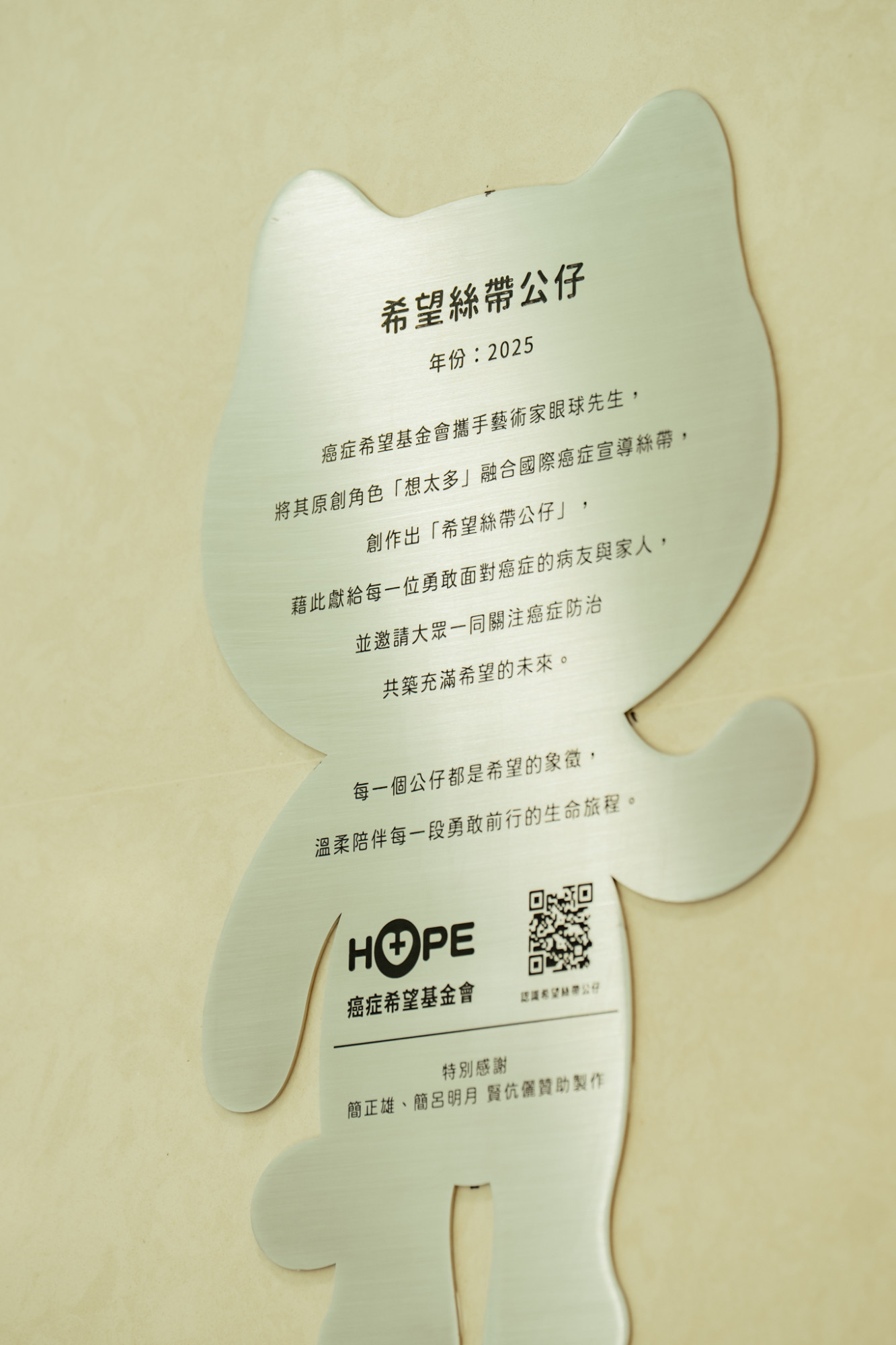 此次展出的21座「希望絲帶公仔」,曾於今年2月4日世界癌症日期間,在華山1914文創產業園區華山劇場前大草皮進行為期一週的快閃展出,透過藝術的力量,成功吸引大眾關注並思考癌症議題。公仔融合眼球先生原創角色「想太多」與象徵各癌別的國際絲帶色彩,對應到20種癌症類別與1隻代表「全癌」的公仔,呼應世界癌症日的主題「UNITED BY UNIQUE」,強調每位癌友都有獨特的需求與故事,呼籲以人為本的癌症照護,應尊重與包容每個人的差異。