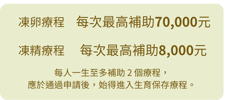 (一) 女性取卵療程,每次補助上限7萬元,男性取精處置保存每次補助上限8千元;若實支金額未達補助上限者,則以實支金額補助之。